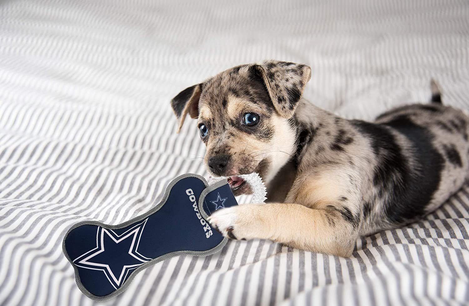 - More features: 3). Built-in SQUEAKER for never-ending fun. 4). Your favorite NFL TEAM NAME embroidered in bright team colors. 5). Bone shaped toy for your four-legged friend.